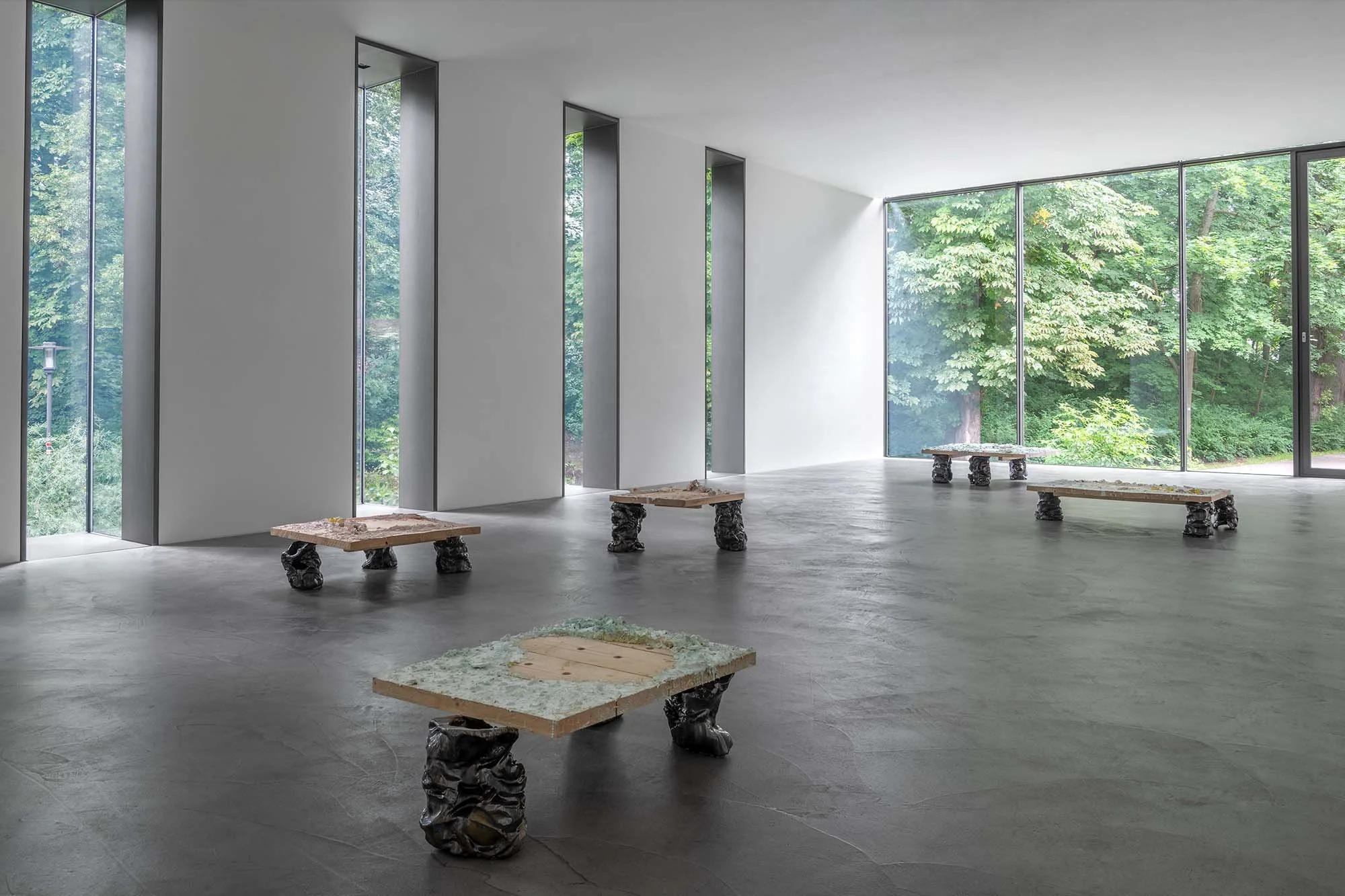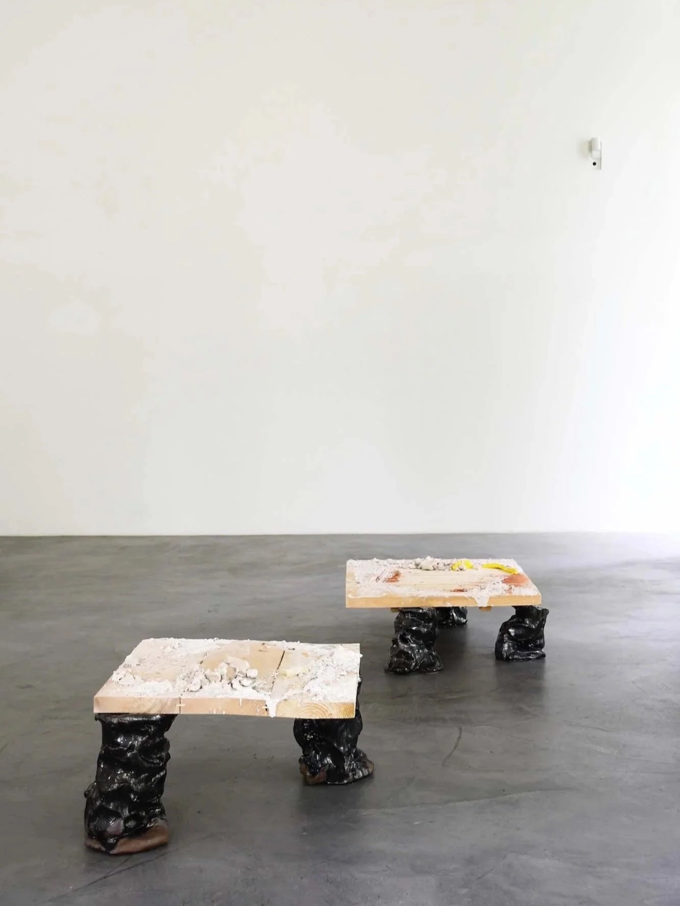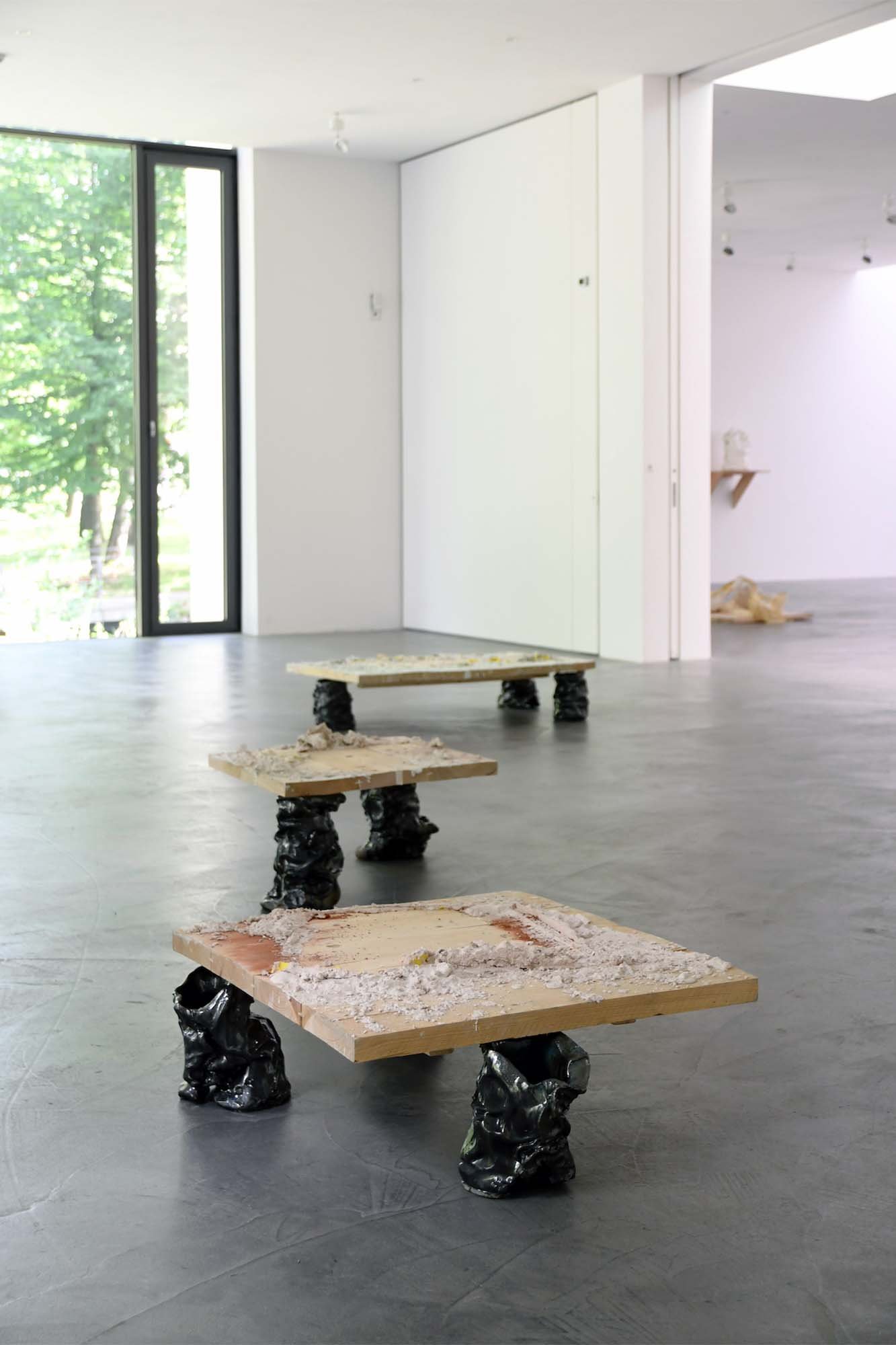 Absence First, part of a larger and visually diverse group of works (since 2019), contradicts the understanding of absence as a state that must be preceded by presence. Claudia Mann starts from the absent, and as in her other works, one can infer a previous action. Five wooden platforms, which appear to be supported by flexible ceramic atlases, have missing pieces. The blind spot, or more precisely, the base that claims something for itself when it is on it, becomes the plastic and also performative moment of these sculptures. C. Mann manifests the real, but also mostly ephemeral traces of work not only as a moment of her action, but as perhaps the most original interpretation of the inseparability of form and inverted counterform. Image and reflection are as contradictory as they are inseparably related to each other, like the mold and the molded. C.Mann circles around the history of architecture and sculpture, which were originally one and the same. Thus, the plinths, the so-called starting surfaces of traditional sculpture, plastic art, and columns can gain a reversal in their interpretation. The ceramics form a supporting, floating, and also elastic-looking stage structure. The missing protagonists are found on the work surfaces, underneath, and form a substantial unity with each other.