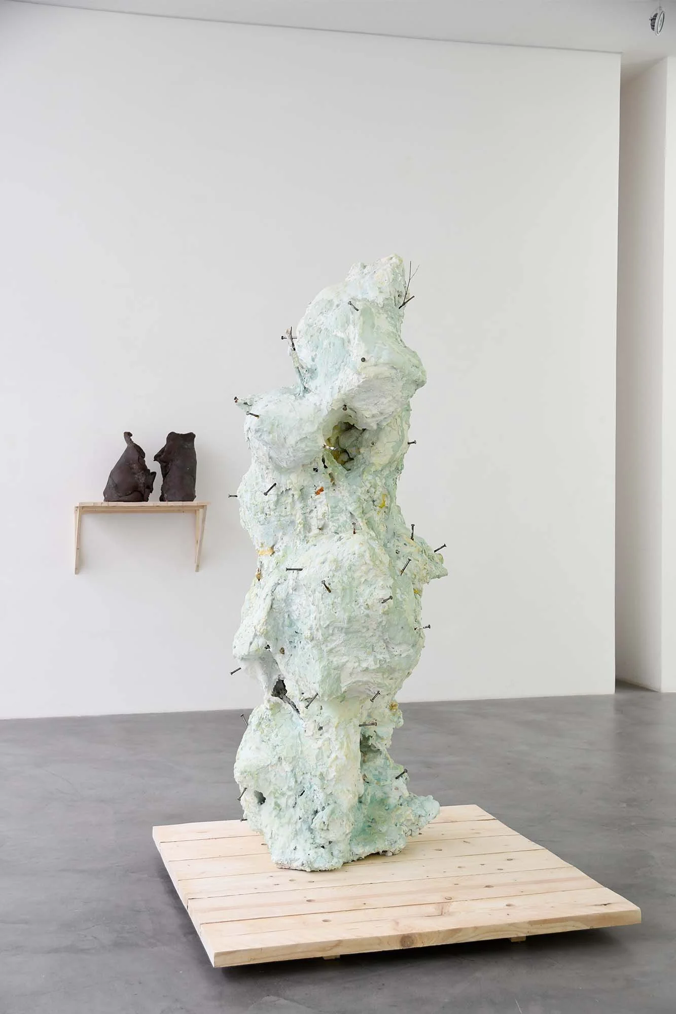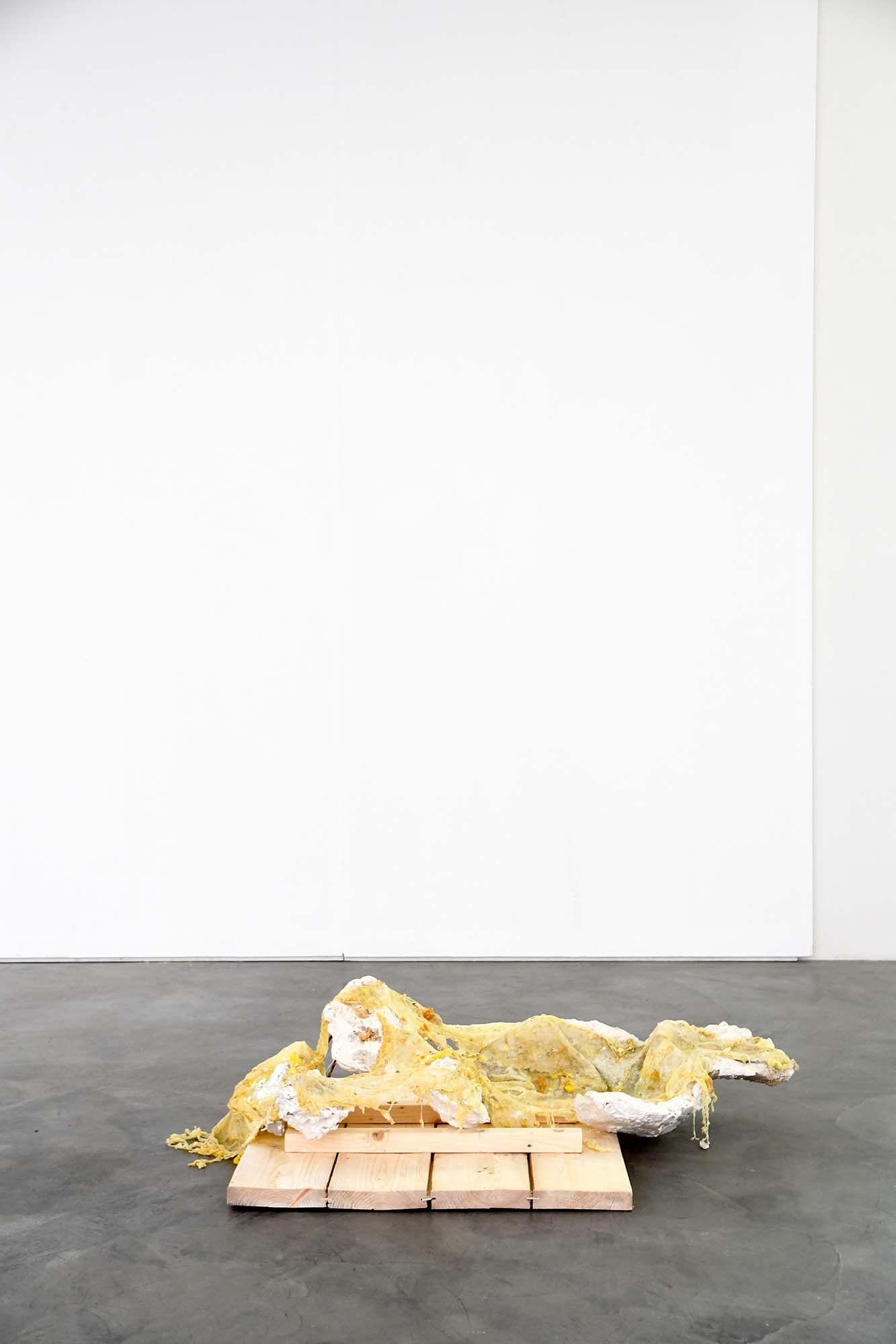 The work Equipoise was created from a cast of the large Equipoise (plaster, green pigmented, ...). It forms a counterpoint to her weight and balance and takes up in particular the figurative nature of the standing Equipoise. Unlike the upright, physically extremely present and voluminous work Equipoise, the plaster formwork and the delicate latex skin adhering to it lie fluidly and deprived of any standing power on the same wooden construction as its upright counterpart – which, however, was turned before being placed.