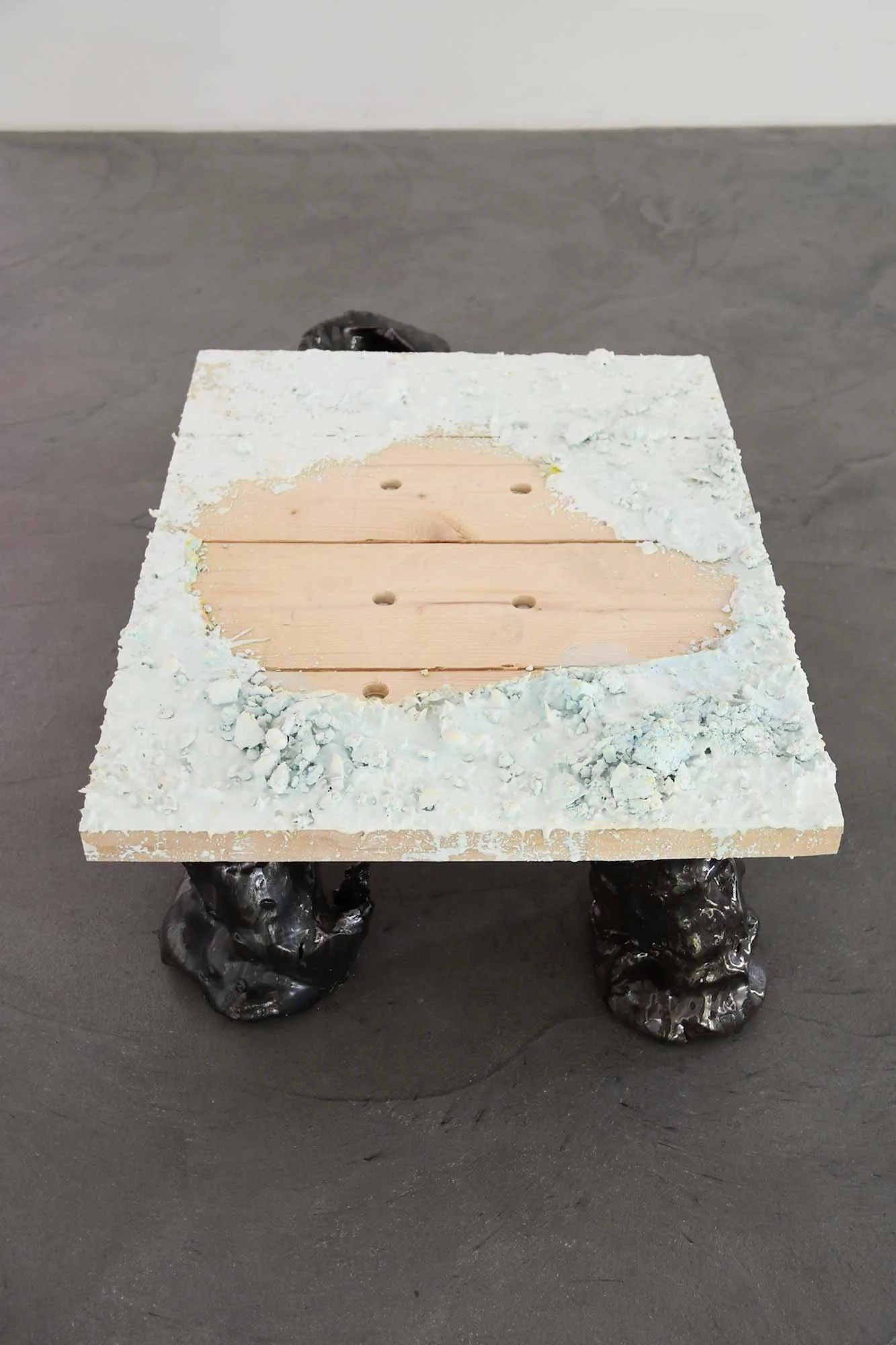 Die sich in C.Manns Werk wiederholenden Holzplateaus sind genaugenommen Arbeitsplatten aus beispielsweise Dielen, die jeweils explizit vor Beginn der Entstehung einer Arbeit, gebaut werden. Die Plateaus sind für C.Mann Bühnenelemente, wie auch der eigens geschaffene Boden der Skulptur. Und so sucht sie eine Art Kontakthof zwischen den geschaffenen ProtagonistInnen, sprich Werken. Das erstmalige Zeigen der Rückseite dieser wiedermals genannten Equipoise, verknüpft sich mit der Umkehrung der Werkgruppe und stellt eine andere Frage: