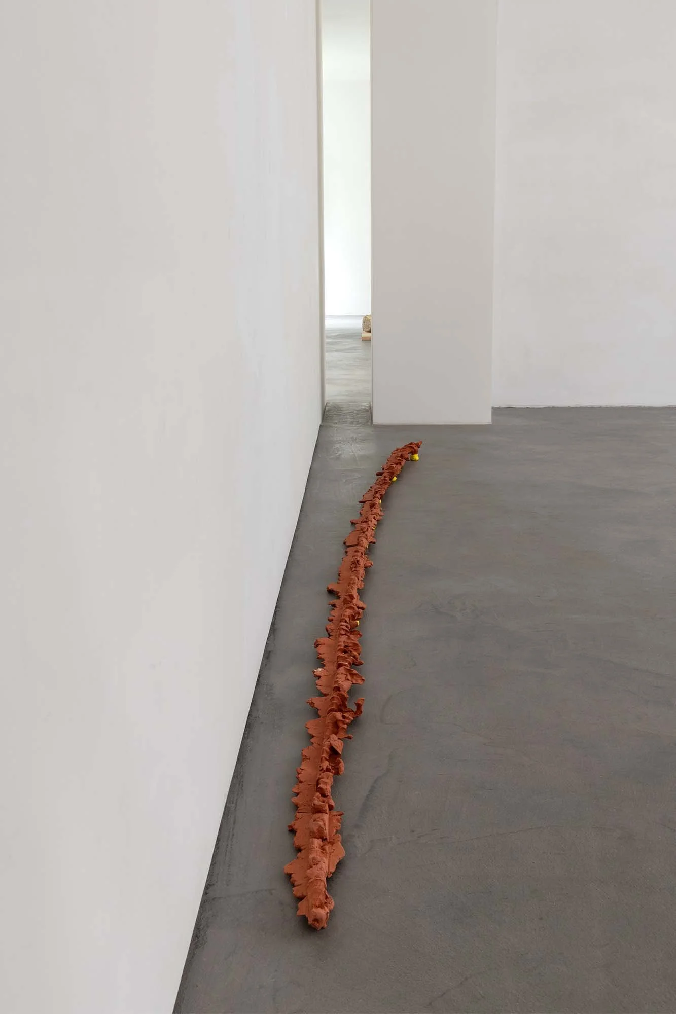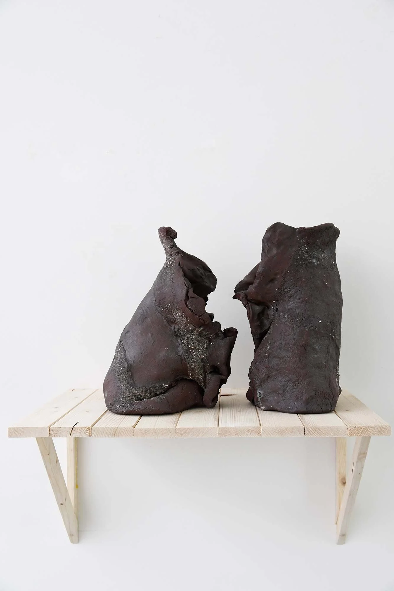 The duet Equipoise (Counterweight) made of fired clay on a wooden wall console consists of two sculptures leaning towards each other made of cylindrically rolled up impressions of the ground, each of which has an imprint of one of the artist's ears. The two ear impressions, which symbolize the artist's listening into the ground, lend the two forms a human physical presence. Like two people dancing or singing a duet, the two hollow bodies seem to interact.