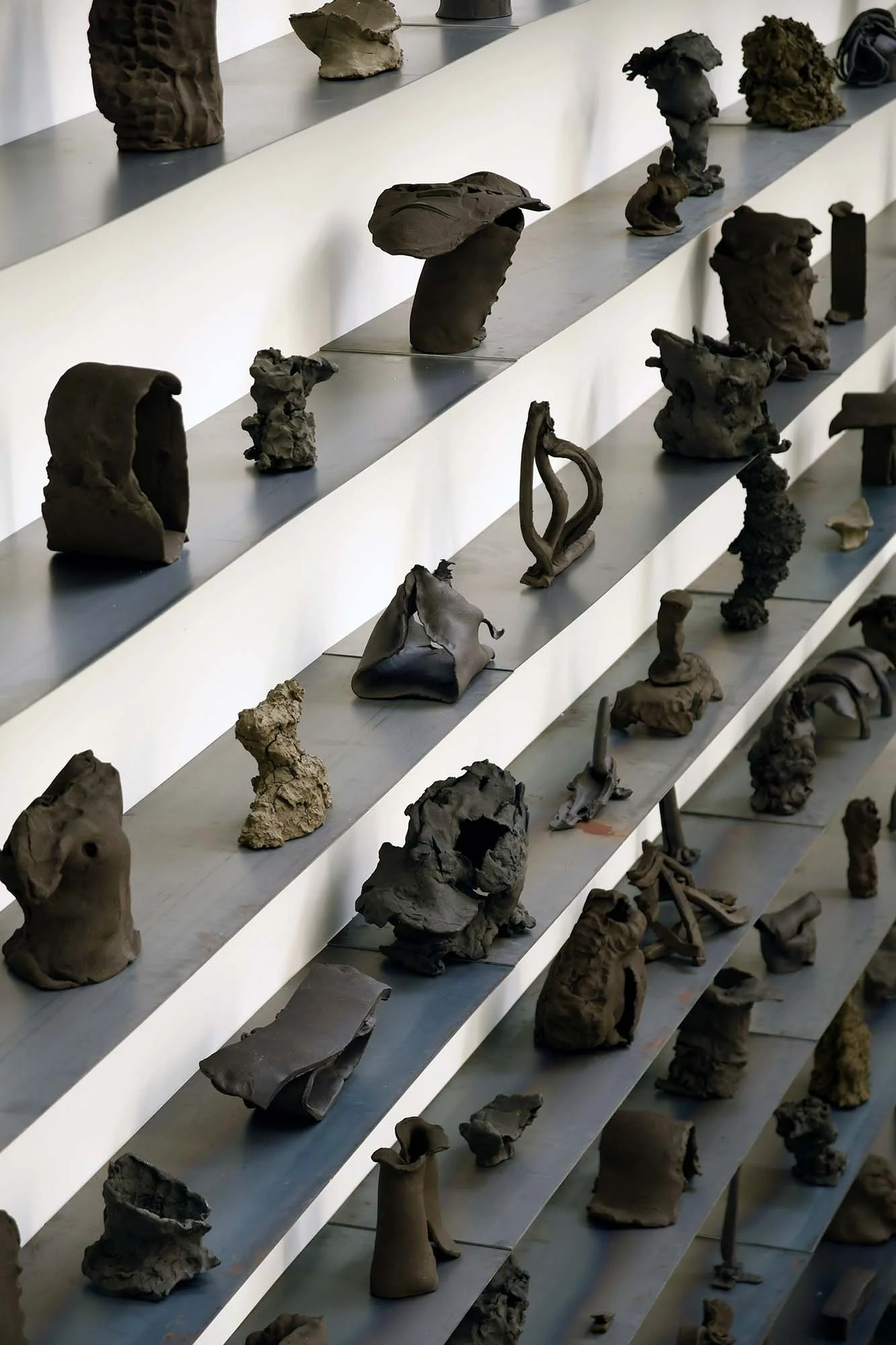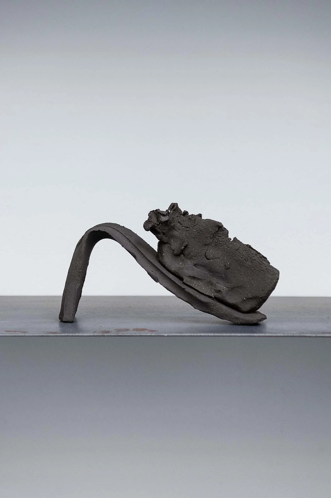 The Headrests offer yet another angle in Mann’s ongoing investigation of embodiment and perception. Inspired by artifacts from ancient Egypt and other (particularly Eastern and Southern) African cultures—used to support the head during sleep or funeral—these sculptures are shaped by a deep contact with the artist’s own life. In some, the imprint of her forehead or nose is subtly embedded in the clay. Each piece becomes both a portrait and a counter- form, simultaneously abstract and intimate, deeply bodily. For Mann, the headrest serves as a spiritual threshold; a point of contact between body and earth, self and world. The installation is an invitation into her own world, her own spirituality as in the soul’s connection to the ungraspable, to ephemerality. The headrests, here, work as a cryptic alphabet—crafted from the artist’s processing of loss and grief, and interwoven with the attempted reconstruction and questioning of familial ties — which guides the viewer in reading the piece as a testimony to care and vulnerability.